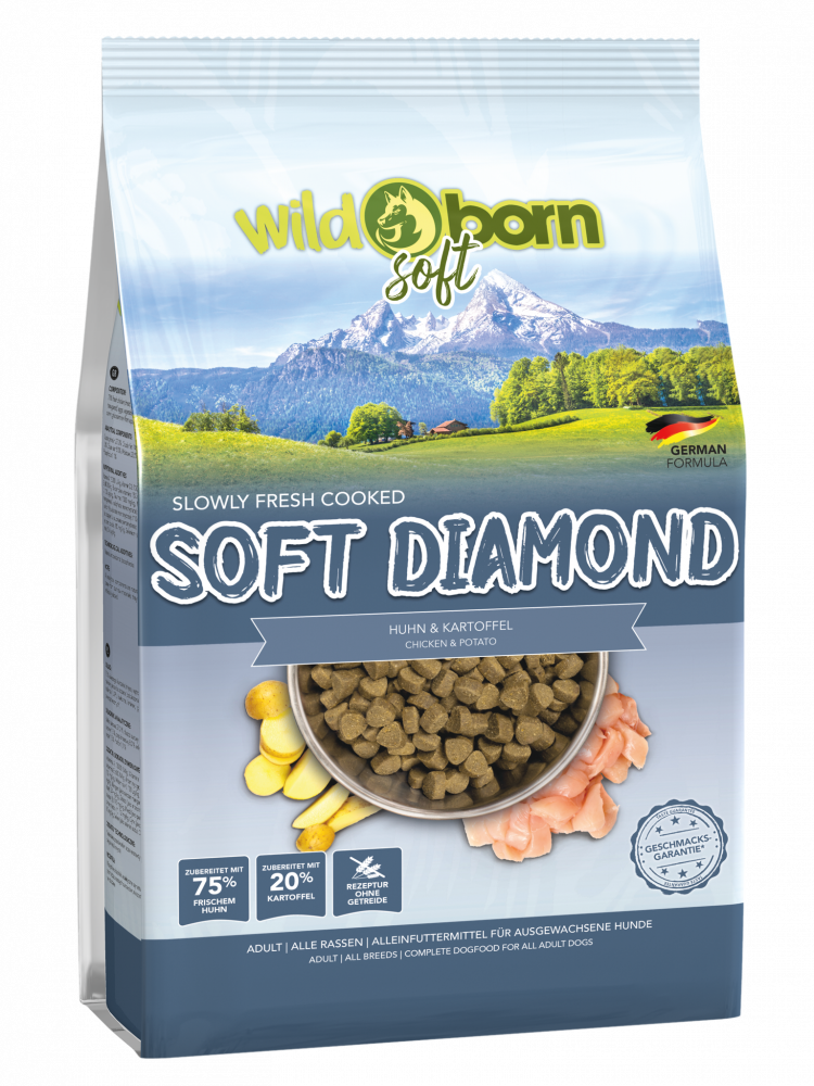 Premium Hundefutter mit der Rezeptur ohne Getreide, produziert mit frischem Hühnchen und Kartoffeln Alleinfuttermittel für ausgewachsene Hunde aller Rassen – mit 75 % frischen Hühnchen – produziert mit einer limitierten Anzahl an Rohstoffen. Unsere speziellen Soft Produkte werden mit extra viel Frischfleisch langsam schonend im eigenen Fleischsaft gekocht. Dadurch werden alle Nährstoffe noch besser zur Verfügung gestellt. Unsere SOFT Produkte sind das besondere Geschmackserlebnis für Ihren Hund, denn die Kroketten haben deutlich mehr Fleischsaft und sind damit umso weicher. Ihr Hund wird es lieben. SOFT DIAMOND mit frischem Hühnchenfleisch ist unsere einzigartig, extrem langsam gekochte Sorte und beliebt bei nahezu allen Hunden – auch für Allergiker geeignet SOFT DIAMOND ist unsere schmackhafte Premiumsorte mit extra viel Hühnchenfleisch für eine tägliche, biologisch artgerechte Ernährung Ihres Hundes. Wir produzieren unter Berücksichtigung neuester wissenschaftlicher Erkenntnisse und haben dabei immer ein Augenmerk auf die ursprüngliche Ernährung der Vorfahren unserer Hunde. Somit stellen wir ein optimal zusammengestelltes Hundefutter her, dass Ihr Hund lieben wird. In der freien Wildbahn fressen Wölfe und Wildhunde nicht ausschließlich Fleisch, sondern auch den Mageninhalt von Beutetieren. Hierdurch nehmen sie Früchte, Gemüse und Kräuter auf. Sie erhalten lebenswichtige Kohlehydrate, Mineralstoffe und Spurenelemente. Alle Wildborn Sorten orientieren sich genau an dieser Form der Nahrung, kombiniert mit dem Wissen von heute. Limitierte Rohstoffen für optimale Verträglichkeit Unser Hundefutter wird aus einer kleinen Anzahl von sorgfältig ausgewählten Rohstoffen hergestellt. Weniger Zutaten, mehr Qualität – so bieten wir Ihrem Hund eine ausgewogene und erstklassige Ernährung, die seinen Bedürfnissen entspricht und die Möglichkeiten von Allergien minimiert. Unsere Softkroketten machen den Unterschied Alle unsere biologisch angemessenen Hundefuttersorten werden unter Berücksichtigung der genetischen Herkunft des Hundes zusammengestellt. Es kommt hierbei nicht ausschließlich auf den hohen Fleischanteil an, sondern auf unseren Fleischsaft. Unsere Softkroketten werden in einem ganz speziellen Produktionsverfahren Dampf-gegart. Hierdurch bleiben die tierischen Eiweiße viel besser erhalten als bei herkömmlichen Produktionsverfahren. Das Frischfleisch kann langsamer im eigenen Fleischsaft "kochen". Dieses kommt nicht nur dem exzellenten Geschmack zugute, sondern hat den Vorteil, dass die Kroketten im Magen nicht aufquellen und hierdurch schneller verdaut werden können. Das Risiko einer gefährlichen Magendrehung kann somit deutlich reduziert werden. Durch die optimierte Nährstoffaufnahme kommt weniger Output hinten als Kot raus. Hier die Vorteile unserer Softkroketten im Überblick: - 75 % Huhn - Rezeptur ohne Getreide - Zusammensetzung für Allergiker geeignet - langsames Dampfgaren - Limitierte Anzahl an Rohstoffen - Magen-Darm-Trakt wird weniger belastet - keine Blähungen und kein Durchfall - kein Aufquellen der Kroketten im Magen, daher verringertes Risiko von Magendrehungen Selbstverständlich sind alle unsere Hundefutter Rezepturen ohne Getreide , denn dies gehört nicht zu den natürlichen Futterbestandteilen der Hundevorfahren. Viele Hunde können Getreide daher nicht gut verdauen oder reagieren allergisch. Besonderheiten Deutsche Produktionsformel Fleischanteil 100 % vom frischen Hühnchen, Rezeptur ohne Getreide produziert Rohwaren in Lebensmittelqualität hypoallergene Zusammensetzung neuste Produktionstechnik für optimalen Soft Genuss ausgewogener Anteil an Omega-6- und Omega-3-Fettsäuren enthält alle notwendigen Nährstoffe, Vitamine und Mineralien empfohlen auch für Allergiker einzigartig im Geschmack softe Krokettenform extrem leicht verdaulich und auch als Snack sehr gut zu füttern frei von Zucker, Soja, Bleichmitteln, Vitamin K3, Geruchs-Farb- oder Geschmacksverstärkern und künstlichen Konservierungsmitteln ohne Sonnenblumenöl und nur mit natürlichen Rohstoffen Zusammensetzung: 75 % frisches Huhn (Fleisch, Leber), 20 % Kartoffel, Rübenschnitzel (entzuckert), Eier, pflanzliches Glycerin (USP), Kurkuma, Kreuzkümmel, Glucosamin (von Wassertieren) Analytische Bestandteile: Protein: 27,0 % Fettgehalt: 14,0 % Rohfaser: 1,5 % Rohasche: 8,0 % Phosphor: 1,1 % Calcium: 1,5 % Feuchtigkeit 22 % Metabolische Energie: 3700 kcal/kg Ernährungsphysiologische Zusatzstoffe je kg Vitamin A: 15 000 I.E. Vitamin D3: 700 I.E. Vitamin E: 600 mg Taurin: 1000 mg/kg Mangan (als Mangan(II)- sulfat, Monohydrat): 34 mg/kg Eisen (als Eisen (II) -sulfat-Monohydrat): 110 mg/kg Kupfer (als Kupfer(II)-sulfat Pentahydrat): 12 mg/kg Zink (als Zinkoxid): 80 mg/kg Selen (als Natriumselenit): 0,4 μg/kg Technologische Zusatzstoffe je kg Natürliche Antioxidationsmittel (Tocopherolextrakte aus pflanzlichen Ölen)