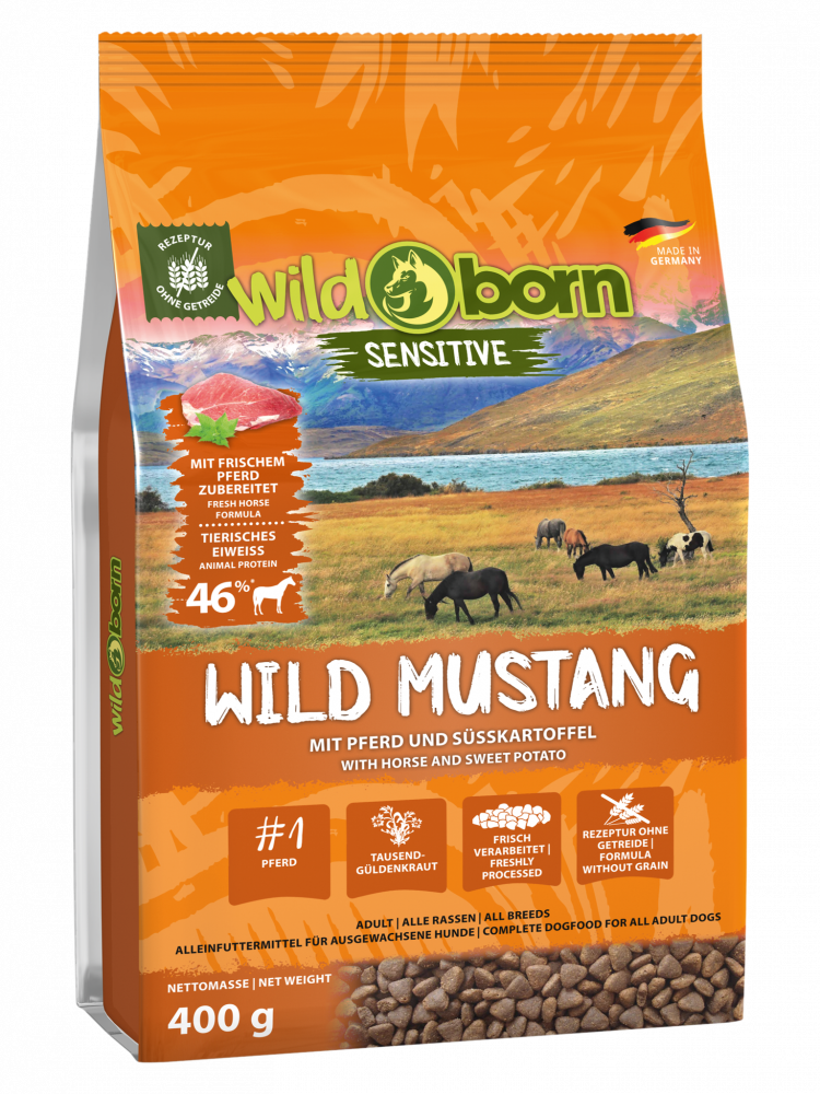Wildborn Wild Mustang Premium Hundefutter mit frischem Pferdefleisch, Süßkartoffel und Aroniabeeren Alleinfuttermittel für ausgewachsene Hunde - mit extra viel Frischfleisch - 46 % - tierisches Protein* Pferdefleisch besitzt einen etwas süßlich, natürlichen Geschmack und ist daher besonders beliebt bei Futter mäkeligen Hunden. Wild Mustang ist unsere schmackhafte Premiumsorte mit Pferdefleisch für eine tägliche, biologisch artgerechte Ernährung Ihres Hundes. Wir produzieren unter Berücksichtigung neuester wissenschaftlicher Erkenntnisse und haben dabei immer ein Augenmerk auf die ursprüngliche Ernährung der Vorfahren unserer Hunde. Somit stellen wir ein hervorragend zusammengestelltes Hundefutter her, dass Ihr Hund lieben wird. In der freien Wildbahn fressen Wölfe und Wildhunde nicht ausschließlich Fleisch, sondern auch den Mageninhalt von Beutetieren. Hierdurch nehmen sie Früchte, Gemüse und Kräuter auf. Sie erhalten lebenswichtige Kohlenhydrate, Mineralstoffe und Spurenelemente. Alle Wildborn Sorten orientieren sich genau an dieser Form der Nahrung, kombiniert mit dem Wissen von heute. Unsere Hauptfleischart ist Pferdefleisch Pferdefleisch ist arm an Fett und außerdem reich an Eisen. Der Fettanteil ist dreimal niedriger als bei Hühnchenfleisch. Zusätzlich weist es einen mäßigen Cholesteringehalt von 60 mg/100 mg auf und enthält wichtige Spurenelemente, Eisen und Zink in höheren Mengen. Das von uns verarbeitete Pferdefleisch stammt von Tieren, die nicht in Massentierhaltungen leben und tierschutzgerecht geschlachtet werden. Es wird absolut kein Fleisch aus Gatterhaltung verarbeitet, sondern ausschließlich von regionalen Pferdeschlachtern. Daher ist das Fleisch von Natur aus nicht belastet und absolut frei von Medikamenten und Hormonen. Der hohe Fleischanteil in unserem Futter sorgt für den bestmöglichen Erhalt der Muskelmasse und unterstützt gesunde Blutzuckerwerte und eine Spitzenkondition für Hunde aller Rassen und aller Lebenslagen. Unsere Heilkräutermischung - Tausendgüldenkraut macht den Unterschied Alle unsere biologisch angemessenen Hundefuttersorten werden unter Berücksichtigung der genetischen Herkunft des Hundes zusammengestellt. Es kommt hierbei nicht ausschließlich auf den hohen Fleischanteil an, sondern unser "Geheimrezept" ist unsere besondere Mischung aus Heilkräutern. Wir verwenden so wertvolle Pflanzen wie Yucca-Extrakt, Brennnessel, Brombeerblätter, Schafgarbe, Fenchel, Kümmel, Kamillenblüten, Mistelkraut, Enzianwurzel und die besondere Heilpflanze Tausendgüldenkraut. Tausendgüldenkraut ist ein Verwandter des Enzians, fördert die Verdauungstätigkeit und regt die Bildung der Verdauungssäfte an. Seine verdauungsfördernde Wirkung und die damit verbundene Stärkung sind so ausgeprägt, dass das Tausendgüldenkraut zu den ganz besonders wertgeschätzten Heilpflanzen gehört. Das wird auch schon in seinem Namen mehr als deutlich. Selbstverständlich sind alle unsere Hundefutter Rezepturen ohne Getreide, denn dies gehört nicht zu den natürlichen Futterbestandteilen der Hundevorfahren. Viele Hunde können Getreide daher nicht gut verdauen oder reagieren allergisch. Besonderheiten Fleischanteil 100 % vom Pferd, ohne Getreide Fleisch in Lebensmittelqualität aus kontrollierter Herkunft hypoallergene Zusammensetzung natürlich angepasste Kombination von Gemüse, Obst und Kräutern ausgewogener Anteil an Omega-6- und Omega-3-Fettsäuren enthält alle notwendigen Nährstoffe, Vitamine und Mineralien empfohlen für Allergiker einzigartig im Geschmack leicht verdaulich frei von Zucker, Soja, Bleichmitteln, Vitamin K3, Geruchs-Farb- oder Geschmacksverstärkern und künstlichen Konservierungsmitteln ohne Sonnenblumenöl Zusammensetzung: Frisches Pferd (18 %), Süßkartoffel (getrocknet, min. 15 %), Kartoffelstärke, Pferdefleisch (getrocknet, 12 %), Kartoffelflocken, tierisches Fett, Erbsen (getrocknet), Kartoffelprotein, Proteinhydrolysat, Preiselbeeren (getrocknet), Blaubeeren, (getrocknet), Bierhefe (getrocknet), Yucca-Extrakt, Brennnessel (getrocknet), Brombeerblätter (getrocknet), Schafgarbe (getrocknet), Fenchel (getrocknet), Kümmel (getrocknet), Kamillenblüten (getrocknet), Mistelkraut (getrocknet), Enzianwurzel (getrocknet), Tausendgüldenkraut (getrocknet, 0,05 %) Analytische Bestandteile: Protein: 24,0 % Fettgehalt: 12,5 % Rohfaser: 2,5 % Rohasche: 8,2 % Calcium: 2,1 % Phosphor: 1,25 % Natrium: 0,22 % Omega-3-Fettsäuren: 0,23 % Omega-6-Fettsäuren: 2,21 % Ernährungsphysiologische Zusatzstoffe je kg Vitamin A: 12 000 I.E. Vitamin D3: 1 200 I.E. Vitamin E: 100 mg Kupfer (als Kupfer-(II)-Sulfat, Pentahydrat): 10 mg Zink (als Zinkoxid): 70 mg Zink (als Aminosäure, Zinkchelat, Hydrat): 5,3 mg Jod (als Calciumjodat, wasserfrei): 2 mg Selen (als Natriumselenit): 0,2 mg Taurin: 300 mg Energiegehalt: 3720 kcal/kg