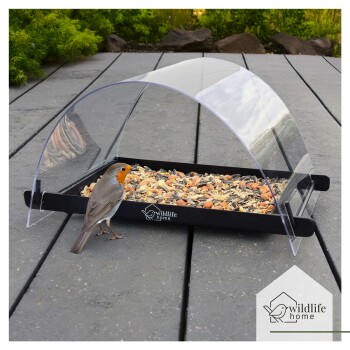 Blickfang für Garten und Balkon Design Bodenfutterstation für Wildvögel Diese WILDLIFE HOME Bodenfutterstation aus strapazierfähigem Metall zeichnet sich durch ihre hohe Wetterfestigkeit aus und kann das ganze Jahr über von Wildvögeln genutzt werden. Besonders ideal für Bodenfresser wie Rotkehlchen, Amseln, Finken und viele mehr, bietet die Futterstation eine leicht zugängliche Futterquelle. Die transparente Kuppel schützt das Futter zuverlässig vor Feuchtigkeit und Schmutz. Luftlöcher im Boden verhindern Schimmelbildung und sorgen für hygienisches Futter. Große Futterplattform für Mehlwürmer, Körnerfutter oder Erdnüsse Transparente Kuppel zum Schutz vor Nässe Löcher im Boden für optimale Luftzirkulation Angepasste Höhe für Bodenfresser Die großzügige Futterplattform ermöglicht die Nutzung von verschiedenen Futtersorten wie Mehlwürmern, Erdnüssen oder Körnerfutter – perfekt für eine abwechslungsreiche Ernährung der Vögel. Alle WILDLIFE HOME Produkte sind mit Liebe zum Detail gefertigt und werden so zum Blickfang in jedem Garten.
