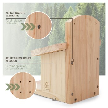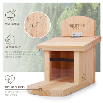 Naturschutzprodukt für einheimische Eichhörnchen Futterhaus für Eichhörnchen Unser wildtier liebe Eichhörnchen-Futterhaus bietet nicht nur eine köstliche Zwischenmahlzeit, sondern ist auch ein bedeutender Schritt, um die heimischen Arten zu fördern und zu unterstützen: Hergestellt aus naturbelassenem, rund 2cm dickem Massiv-Holz, bietet es den niedlichen Nüssenliebhabern einen komfortablen und sicheren Platz, um ihre Leckereien zu genießen. Die Holzelemente sind sorgfältig miteinander verschraubt, um maximale Stabilität zu gewährleisten. Um an die Leckereien zu gelangen, müssen die Eichhörnchen den Deckel anheben - ein Trick, den sie schnell erlernen. Die artspezifische Anpassung sorgt mit verkürzter, kantenfreier Plexiglas-Scheibe und Gummi-Lippe dafür, dass selbst die zartesten Pfoten ohne Verletzungsgefahr auf Erkundungstour gehen können. 100% aus wetterfestem & naturbelassenem Holz Artspezifisch angepasst mit verkürzter, kantenfreier Scheibe Gutes Klima durch naturbelassenem rd. 2cm dickem Massiv-Holz Wertige Verarbeitung mit verschraubten Holzelementen Nachhaltige Waldwirtschaft: Bei wildtier liebe setzen wir auf FSC-zertifiziertes Holz, um sicherzustellen, dass all unsere Naturschutzprodukte hohe Beständigkeit und Langlebigkeit bieten.