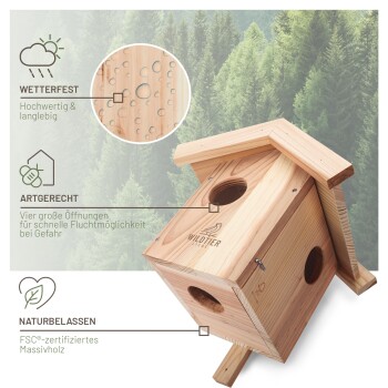 Naturschutzprodukt für einheimische Eichhörnchen Eichhörnchen Kobel - Ein Nest für Eichhörnchen Sorge dafür, dass Eichhörnchen in Deinem Garten ein sicheres und artgerechtes Zuhause finden – mit unserem wildtier liebe Eichhörnchenkobel aus robustem Naturholz. Speziell entwickelt, um den Bedürfnissen der Tiere gerecht zu werden, bietet dieser Kobel einen idealen Ort zum Schlafen, Nisten und zur Aufzucht ihrer Jungen. Gefertigt aus unbehandeltem, naturbelassenem Holz, bietet der Kobel ein langlebiges, wetterfestes Zuhause für die kleinen Nager. Mehrere Ein- und Ausgänge ermöglichen es den Tieren, im Falle von Gefahr schnell zu entkommen, was ihnen ein zusätzliches Gefühl von Sicherheit gibt. Der Innenraum ist so konzipiert, dass er optimalen Schutz vor Witterungseinflüssen wie Regen und Kälte bietet, während die natürliche Belüftung für ein angenehmes Klima im Kobel sorgt. Hier können die kleinen Nager ungestört schlafen, nisten und ihre Jungen aufziehen – geschützt vor Fressfeinden. Auf überflüssige Ansitze oder Vorsprünge, die Raubtieren wie Katzen oder Greifvögeln als Jagdunterstützung dienen könnten, wurde bewusst verzichtet. 100% aus naturbelassenem rd. 2cm dickem Massiv-Holz Ohne gefährlichen Balkon oder Ansitz für Feinde Artspezifisch angepasst mit mehreren Ein- und Ausgängen zur schnellen Flucht vor Feinden Wertige Verarbeitung mit verschraubten Holzelementen Seitliche Öffnungsmöglichkeit erleichtert die Reinigung Nachhaltige Waldwirtschaft: Bei wildtier liebe setzen wir auf FSC-zertifiziertes Holz, um sicherzustellen, dass all unsere Naturschutzprodukte hohe Beständigkeit und Langlebigkeit bieten. Inklusive Ratgeber „ Ein Garten für Eichhörnchen": Zusätzlich zu dem Eichhörnchen-Kobel erhältst Du unseren informativen wildtier liebe Ratgeber. Dieser Ratgeber bietet wertvolle Tipps und Ratschläge, um Deinen Garten in ein Eichhörnchenparadies zu verwandeln.