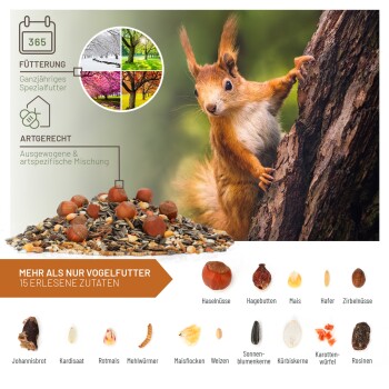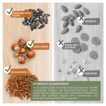 Naturnahe & ausgewogene Futtermischung Spezialfutter für Eichhörnchen Eichhörnchen sind die wahren Akrobaten der Natur - verspielt, flink und immer auf der Suche nach einem köstlichen Snack. Verwöhne Deine kleinen pelzigen Freunde mit unserem wildtier liebe Eichhörnchen-Futter. Als echtes Spezialfutter ähnelt es deutlich der natürlichen Nahrung des Eichhörnchens - es enthält eine vielfältige Auswahl an Leckereien wie Haselnüsse, Sonnenblumenkerne, Kürbiskerne, Hagebutten und Rosinen. Jede Portion ist reich an Proteinen, gesunden Fetten und wichtigen Nährstoffen, um die Vitalität und das Wohlbefinden Deiner kleinen Besucher zu unterstützen. WIR SETZEN AUF REGIONALITÄT Unser wildtier liebe Eichhörnchenfutter wird in einer traditionellen Mühle in Deutschland hergestellt. Die Mühle wird in der 5. Generation geführt und besteht seit über 200 Jahren. Wir von wildtier liebe distanzieren uns von industriellem billigem und minderwertigem Massenfutter und fühlen uns auch unseren Wildtieren gegenüber mit qualitativen und artgerechten Futterprodukten verpflichtet. Das Schulden wir der Natur und tragen hiermit zudem einen wertvollen Beitrag zu einem nachhaltigem Natur-Artenschutz bei. 100% Naturprodukt - Hergestellt in Deutschland Artspezifisch angepasst mit Haselnüssen, Sonnenblumenkernen, Hagebutten u.a. Ganzjährige Fütterung durch ausgewogene Futtermischung Geeignet für alle einheimischen Eichhörnchen & sibirischen Streifenhörnchen