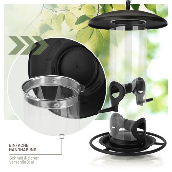 Für eine hygienische Vogelfütterung Futtersäule für Samen, Körner & Kerne Mit einer Höhe von 26 Zentimetern bietet unsere wildtier liebe Vogelfuttersäule eine großzügige Kapazität für Körnerfutter, das perfekt auf die Bedürfnisse verschiedener Vogelarten zugeschnitten ist. Egal, ob Spatzen, Meisen, Finken oder andere gefiederte Gäste in Deinem Garten erscheinen - diese Futterstation ist einladend und ansprechend für alle. Die robuste Konstruktion gewährleistet Langlebigkeit und Stabilität. Dank des hochwertigen Materials bietet der Körner-Vogelfutterspender den Vögeln eine sichere und verlässliche Futterquelle. Zwei stabile Sitzstangen sowie ein Anflugring gewährleisten eine sichere Lande- und Fütterungsplattform für Vögel, die gerne Körnerfutter genießen. Mit einem Durchmesser von 7 Zentimetern bietet diese Futtersäule ausreichend Platz, um eine Vielzahl von Körnern und Samen zu beherbergen. Der transparente Korpus ermöglicht eine einfache Kontrolle des Füllstandes, sodass Du immer rechtzeitig für Nachschub sorgen kannst. Darüber hinaus gewährleistet die Futtersäule eine saubere und trockene Umgebung für die Vogelfütterung, wodurch eine längere Haltbarkeit des Vogelfutters sichergestellt wird. Aus wetterfestem und beschichtetem Metall Transparenter Futterbehälter schützt vor Schimmel, Verschmutzungen & Nässe Drehbarer Deckel ermöglicht eine leichte Befüllung und Reinigung Verstellbare Aufhängevorrichtung für eine flexible Befestigung im Garten Tipp: Wildvögel wie Finken, Kernbeißer, Zeisig, Stieglitz, Meisen Gimpel, Sperling lieben Körnergemische. Mehr wertvolle Tipps und Informationen zu unseren Wildvögeln im Garten haben wir im Paket beigelegten Ratgeber ‘Ein Futterplatz für Gartenvögel‘ gesammelt!