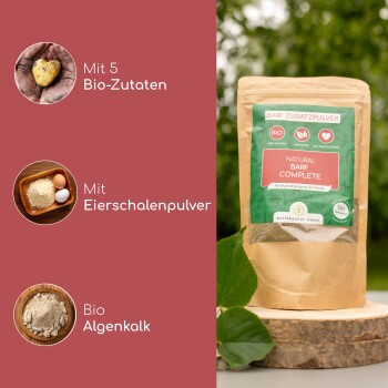 GANZHEITLICHE NÄHRSTOFFQUELLE: Unterstütze die tägliche Ernährung deines Hundes mit unserem BARF Zusatzpulver, das essentielle Vitamine, Mineralstoffe und Kräuter für eine optimale Gesundheit enthält. FÖRDERT DIE VITALITÄT: Die einzigartige Mischung aus natürlichen Zutaten wie Seealgenmehl und Bio Gras- und Bio Kräuterextrakten stärkt das Immunsystem und fördert die Vitalität deines Hundes. IDEAL FÜR ALLE HUNDE: Egal ob jung oder alt, unser Zusatzpulver passt perfekt zu jedem Hund und jeder Ernährungsweise, von BARF bis zu handelsüblichem Futter. LEICHT ZU DOSIEREN: Das feine Pulver mischt sich problemlos unter jedes Futter, sodass du sicher sein kannst, dass dein Hund alle benötigten Nährstoffe erhält. HERGESTELLT MIT BIO-ZUTATEN: - Vertraue auf die hohe Qualität unseres Produkts, das zu 18% aus Bio-zertifizierten Zutaten besteht und frei von künstlichen Zusätzen ist.