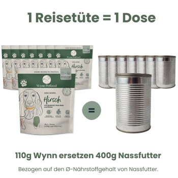 "Entdecke mit Wynn eine völlig neue Art der Fütterung - ausgezeichnet mit dem Fressnapf Innovation Award. . Das Nassfutter zum Selbstanrühren kombiniert höchste Qualität mit maximaler Frische. Dank schonender Gefriertrocknung kommt das Futter ganz ohne Konservierungsstoffe oder unnötige Zusätze aus. Statt fertiger Dosenkost erhältst du bei Wynn eine clevere Trockenzubereitung, die erst beim Anrühren mit Wasser zu einem vollwertigen, saftigen Nassfutter wird – wie frisch gekocht. Die Packung entsorgst du ganz einfach im Altpapier und sparst so täglich Dosenmüll ein. Was macht Wynn so besonders? Frisch zubereitet bei jeder Mahlzeit: Die Trockenzubereitung wird erst beim Anrühren mit Wasser aktiviert – geöffnete Tüten sind auch bei Raumtemperatur haltbar, ohne künstliche Konservierung. 100 % natürliche Zutaten: Gefriergetrockneter Hirsch aus der Region, verfeinert mit Birne, Brokkoli und wertvollen Kräutern. Frei von Zucker, Getreide, künstlichen Aromen oder Füllstoffen. Ideal für empfindliche Hunde: Durch die schonenden Gefriertrocknung und die hochwertige Rezeptur ist Wynn besonders gut verträglich – auch bei sensibler Verdauung oder Futtermittelunverträglichkeiten. Umweltfreundlich & platzsparend: Die kompakte Papierverpackung spart Platz und reduziert CO₂. Außerdem entsteht deutlich weniger Verpackungsmüll als bei herkömmlichem Dosenfutter. Volle Kontrolle über die Konsistenz: Ob eher cremig oder stückig – du entscheidest, wie dein Hund sein Futter liebt. Erhältlich in praktischen Reisetüten oder als Vorratspackung. Jede Reisetüte (110g) entspricht dem Nährwert einer Dose (400g Nassfutter). Jede Vorratspackung (660g) entspricht dem Nährwert von 6 Dosen (je 400g Nassfutter). Alle Rezepturen werden wissenschaftlich entwickelt und mit Liebe im Familienbetrieb in Deutschland hergestellt. Für das Futter werden ausschließlich Zutaten von höchster Qualität verwendet und auf möglichst schonende Weise verarbeitet. Füttere deine Fellnase gesund, nachhaltig und praktisch mit dem prämierten Futter von Wynn Petfood. Wynn ist Alleinfutter für ausgewachsene Hunde."