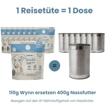 ""Entdecke mit Wynn eine völlig neue Art der Fütterung - ausgezeichnet mit dem Fressnapf Innovation Award. . Das Nassfutter zum Selbstanrühren kombiniert höchste Qualität mit maximaler Frische. Dank schonender Verarbeitung kommt das Futter ganz ohne Konservierungsstoffe oder unnötige Zusätze aus. Statt fertiger Dosenkost erhältst du bei Wynn eine clevere Trockenzubereitung, die erst beim Anrühren mit Wasser zu einem vollwertigen, saftigen Nassfutter wird – wie frisch gekocht. Die Packung entsorgst du ganz einfach im Altpapier und sparst so täglich Dosenmüll ein. Was macht Wynn so besonders? Frisch zubereitet bei jeder Mahlzeit: Die Trockenzubereitung wird erst beim Anrühren mit Wasser aktiviert – geöffnete Tüten sind auch bei Raumtemperatur haltbar, ohne künstliche Konservierung. 100 % natürliche Zutaten: Hypoallergenes Insektenprotein, verfeinert mit Erbse, Apfel und wertvollen Kräutern. Frei von Zucker, Getreide, künstlichen Aromen oder Füllstoffen. Ideal für empfindliche Hunde: Durch die schonende Verarbeitung und die hochwertige Rezeptur ist Wynn besonders gut verträglich – auch bei sensibler Verdauung oder Futtermittelunverträglichkeiten. Umweltfreundlich & platzsparend: Die kompakte Papierverpackung spart Platz und reduziert CO₂. Außerdem entsteht deutlich weniger Verpackungsmüll als bei herkömmlichem Dosenfutter. Volle Kontrolle über die Konsistenz: Ob eher cremig oder stückig – du entscheidest, wie dein Hund sein Futter liebt. Erhältlich in praktischen Reisetüten oder als Vorratspackung. Jede Reisetüte (110g) entspricht dem Nährwert einer Dose (400g Nassfutter). Jede Vorratspackung (660g) entspricht dem Nährwert von 6 Dosen (je 400g Nassfutter). Alle Rezepturen werden wissenschaftlich entwickelt und mit Liebe im Familienbetrieb in Deutschland hergestellt. Für das Futter werden ausschließlich Zutaten von höchster Qualität verwendet und auf möglichst schonende Weise verarbeitet. Füttere deine Fellnase gesund, nachhaltig und praktisch mit dem prämierten Futter von Wynn Petfood. Wynn ist Alleinfutter für ausgewachsene Hunde."